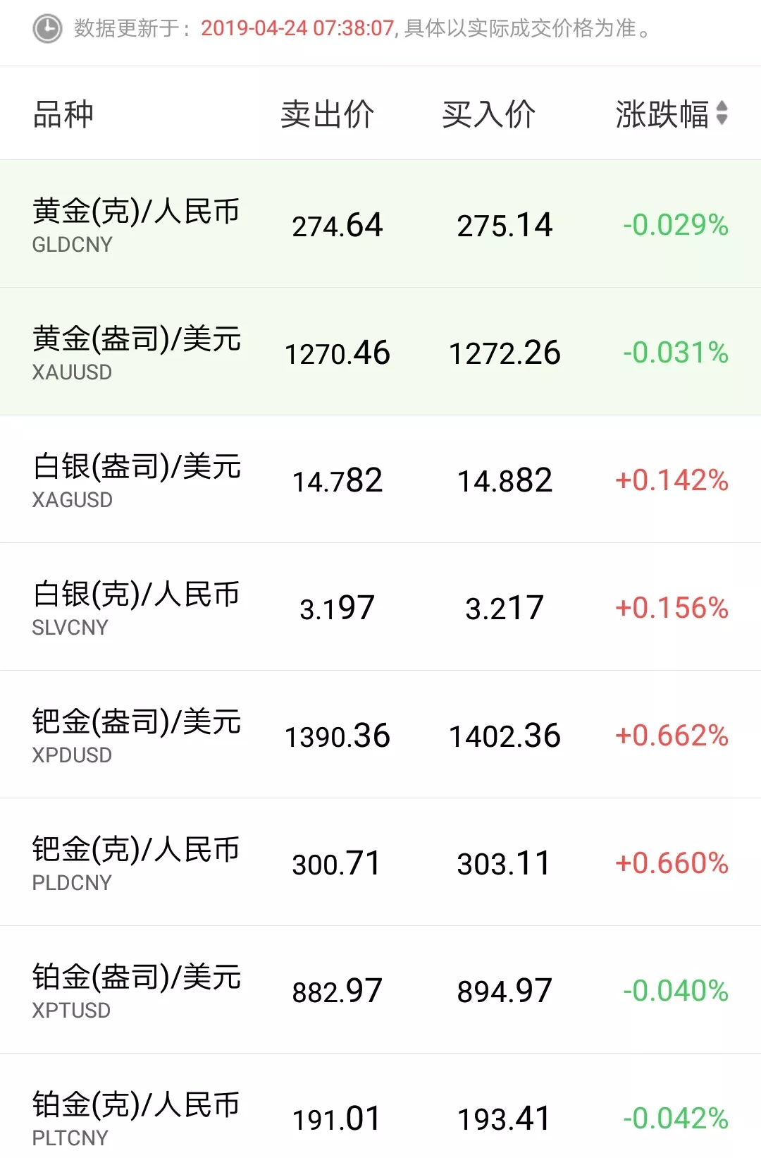 【今日牌价】2019年4月24日贵金属、原油外汇行情和中国银行外汇牌价