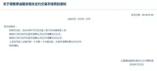 2018年7月3日晚间,能源中心发布《关于调整原油期货相关合约交易手续费的通知(上能办发[2018] 21号),自2018年7月5日交易(即7月4日晚夜盘)起:原油SC1810合约交易手续费从20元/手调整为5元/手。原油SC1811合约交易手续费从20元/手调整为10元/手。上述合约进入交割月前一个月第一个交易日起,交易手续费恢复为20元/手。