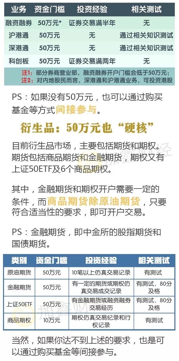 目前中国资本市场主要投资工具,包括A股和衍生品(期货、期权),而近日随着科创板细则的出炉,A股和期货的投资门槛也再度更新!从资金门槛来说,50万元几乎都可以参与,但是像融资融券业务、科创板等,对于投资经验也有一定的要求……