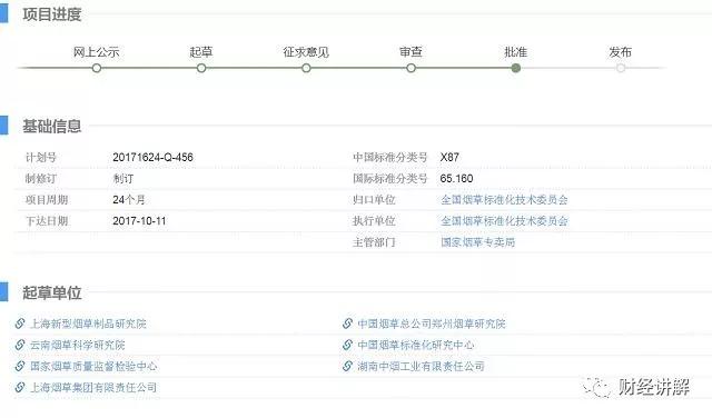 记者查询国家标准化管理委员会官方网站也显示,于2017年10月下达的《电子烟》国家标准制定计划,项目进度要经过网上公示、起草、征求意见、审查、批准、发布几个阶段,目前项目状态已进入“正在批准”阶段,按标准的制订周期24个月及12个月内将由国标委批准通过并发布,项目正式结束时间剩下4个月左右。届时中国电子烟生产流通将依据国家标准要求执行。
