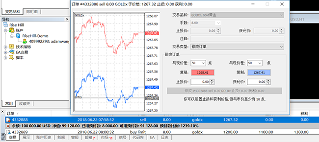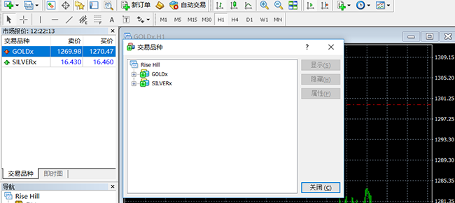 点击左上角【文件】-【登录到交易账户】,在弹出窗口中填写官网注册真实账户的账号密码,选择RiseHill-Live,点击登录。