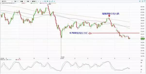 短线及中线技术面偏空,建议反弹至澳日50、100、200日均线(77.78、78.24、79.40) 尝试空单。但因盘势偏弱,建议在操作上可以留意在短线压力区75.80~76.30布局空单。