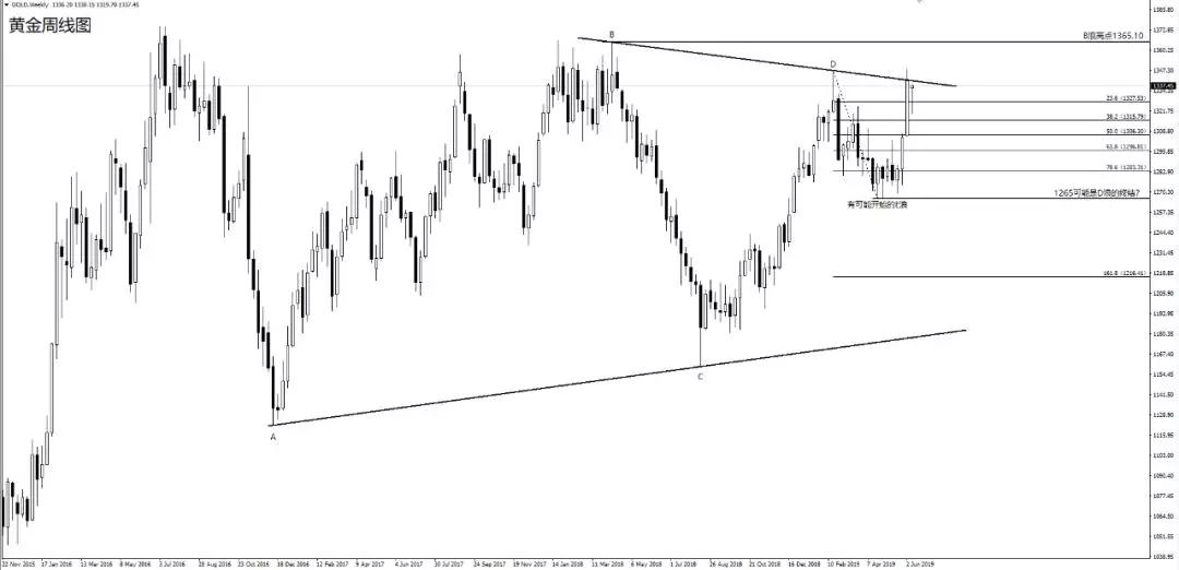 图为黄金周线走势图,从图上可以看到,如果开始于2016年7月的三角形调整结束,那么这说明黄金可能形成新一轮大幅反弹走势,未来可能上涨到1400点,甚至可能会到1500点。若金价能突破B浪的高点1365点附近,那么这将加强看涨黄金的前景。