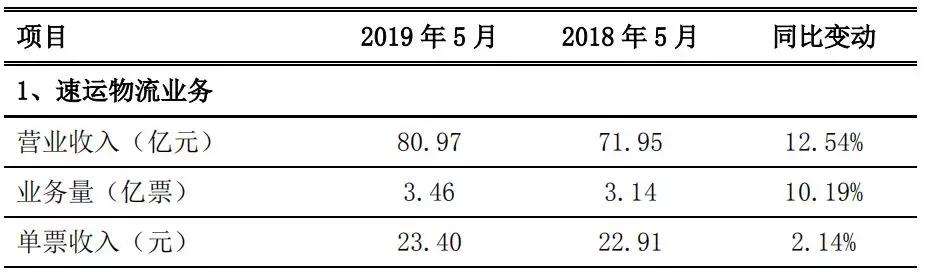 【申通5月快递服务业务收入18.11亿元】申通快递发布2019年5月经营简报,5月份,公司快递服务业务收入为18.11亿元,同比增长44.24%;完成业务量5.97亿票,同比增长47.53%;快递服务单票收入为3.03元,同比下降2.26%。