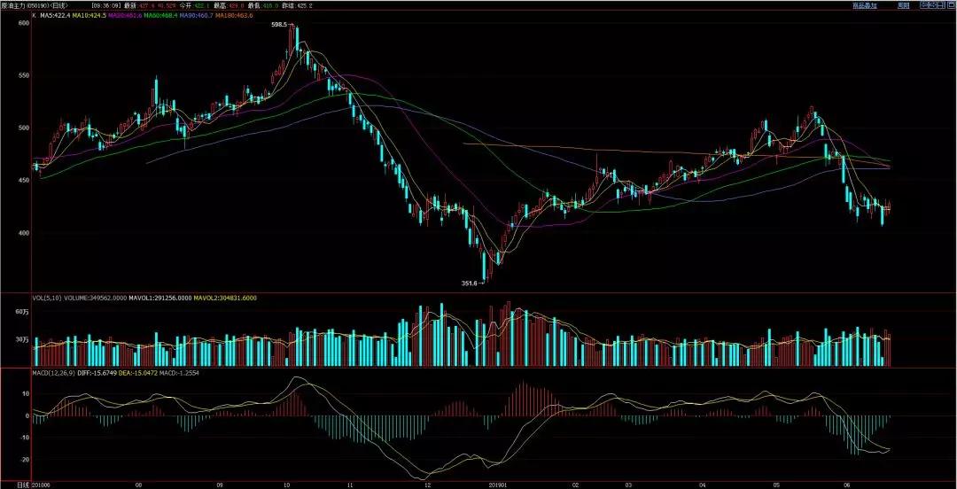 2.上海原油期货:日线图上,周三(19日)原油1908合约价格止跌反弹收一根带颈线的光脚阳线,盘中最高触及432.1元/桶,收报424.8元/桶,日内涨幅1.05%,市场成交396952,持仓47896,K线形态上看,目前盘面上方存有一定压力,短线原油08合约或存技术回调需求。多空力量博弈来看,40日波段行情中,市场空头占据主导,市场下行主趋势大概率延续;长期看,市场多头仍占据主导,原油08合约深V反弹格局或仍有延续。均线走势看,MA5、MA10形成死叉放量,短期市场看空情绪偏弱,MACD黄白线在0轴下方有形成金叉的趋势,空头量能基本出尽。综合来看,短期原油1908合约价格反弹趋势大概率延续,短线或存技术回调需求,上方关注442.2一线压力。若原油08合约突破上方压力,后市大概率继续挑战470一线压力,若不能突破,原油08合约或将回调考验406.0一线支撑。