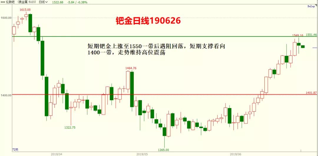 钯金:短期钯金上涨至1550一带后遇阻回落,短期支撑看向1400一带,走势维持高位震荡。