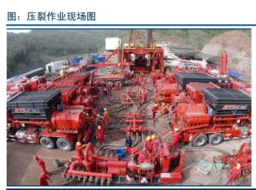 压裂在油服产业链占比较高(23%左右),压裂施工是利用水力作用,使油层形成裂缝的一种方法。常规压裂过程是用压裂车,把高压大排量具有一定粘度的液体挤入油层,当把油层压出许多裂缝后,加入支撑剂(如石英砂等)充填进裂缝。