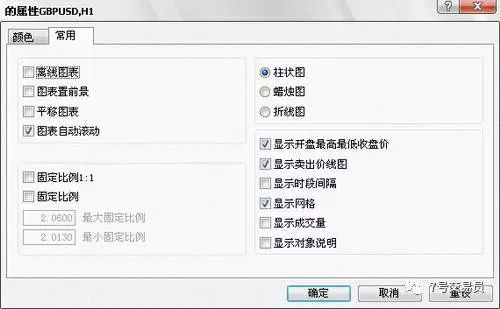 图表是一种金融品种价格动态的时间模型,可以执行主菜单“图表-属性”来显示图表属性窗口, 也可以通过图表的右键菜单选择“属性”或直接按F8键来显示。在此窗口中可以自定义图表颜色(颜色页中):