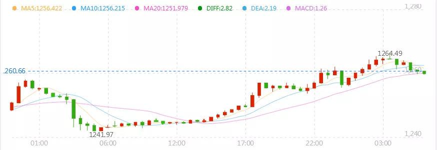 国际现货黄金周四亚市早盘开于1242.71美元/盎司后金价一度经历了一波短暂下挫的行情,但金价在录得日内低点的1242.50美元/盎司后开始反弹,小幅攀升。 欧市金价延续涨势,不断走高。到了 美市金价跌宕起伏,多空争夺激烈,空方终占上风 ,黄金回吐部分涨幅 ,在录得日内高点1266.40美元/盎司后,金价转跌,终收于1259.39 美元/盎司。