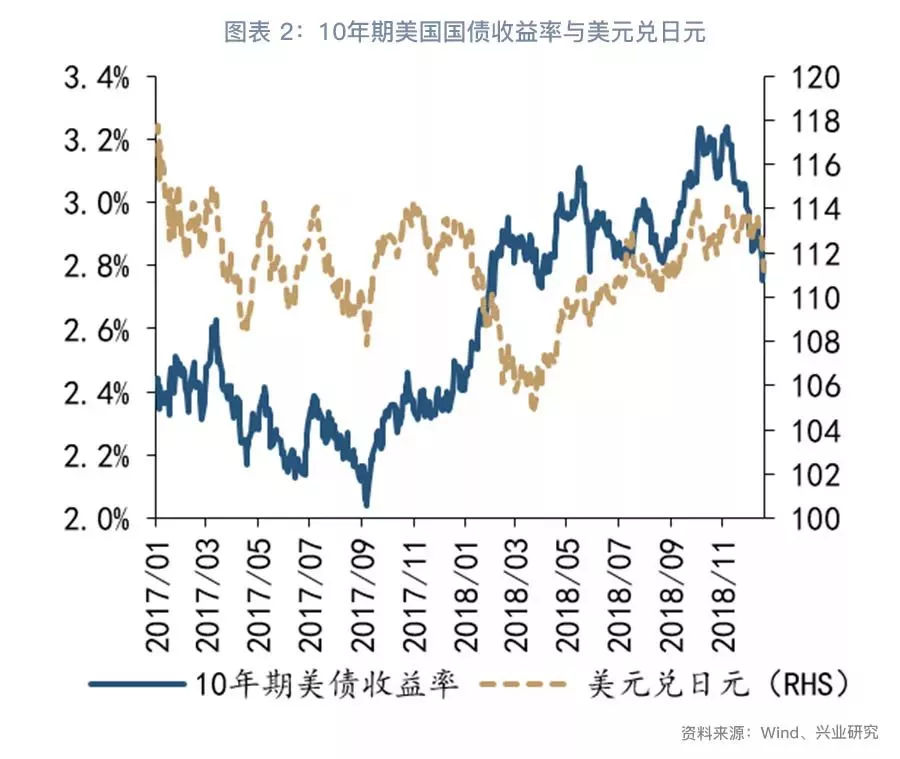 一般我们会将日元与美债收益率以及美股的走势联系起来,但是美股从10月初开始调整,美债收益率从11月初开始冲高回落,而美元兑日元直至12月中旬才开始转向(见图表 1和图表 2),传统逻辑在2018年第四季度的解释力有所下降。