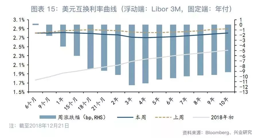 利率互换方面,国债收益率曲线出现局部倒挂后,期限利差继续“恶化”。尽管美联储12月如期加息,但市场对明年加息预期仍比较谨慎,美元利率互换曲线长端利率继续大幅下跌,曲线有进一步倒挂的风险(见图表 10和图表 11)。