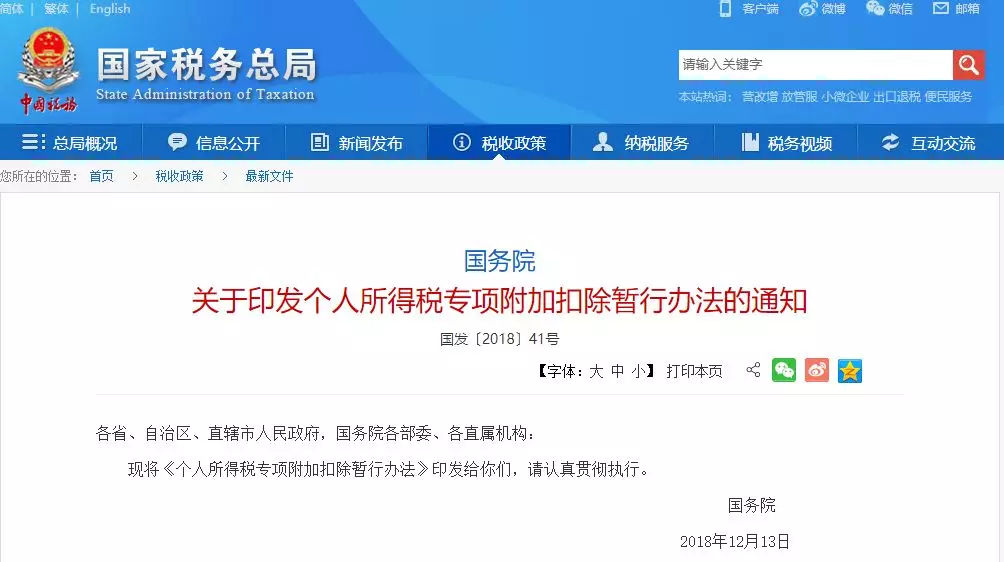 国务院日前正式印发《个人所得税专项附加扣除暂行办法》,自2019年1月1日起施行。专项附加扣除项目包括子女教育、继续教育、大病医疗、住房贷款利息、住房租金、赡养老人六大项。