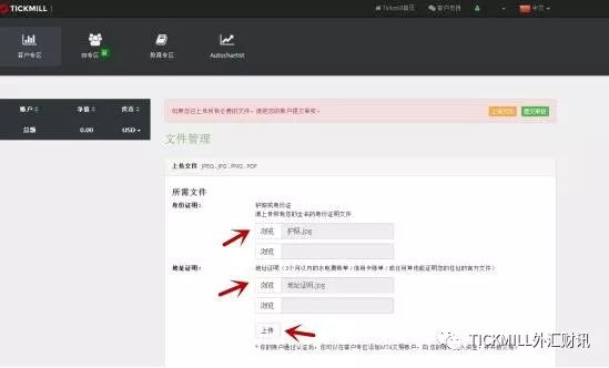 8、点击“浏览”上传身份证明和地址证明。然后点击“上传”。