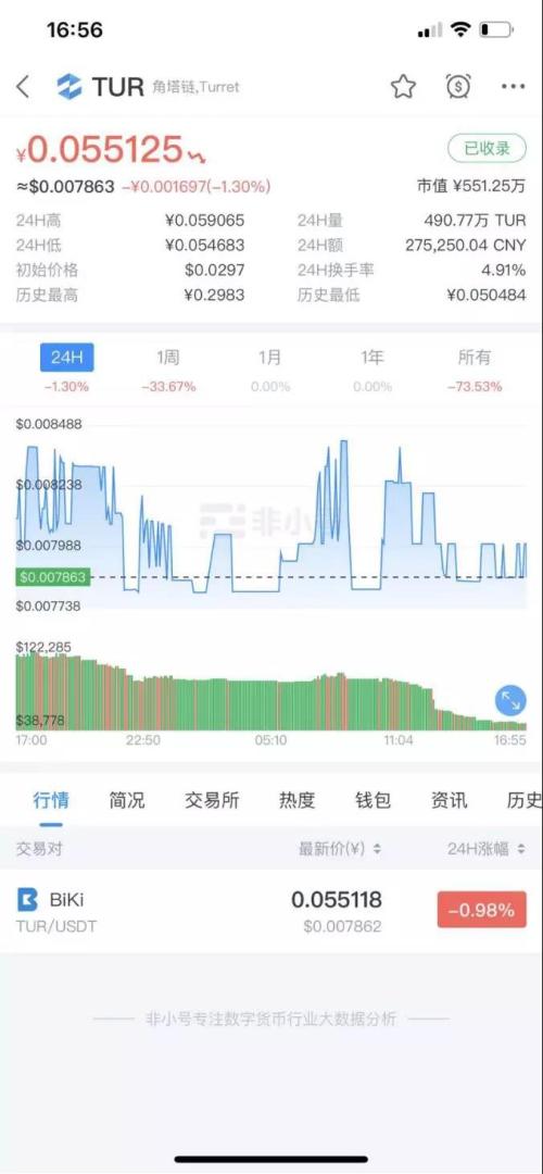 比如10月31日新上线的TUR币(角塔币),上线第二天就跌破发行价。有投资者向记者表示,“TUR私募(币圈私募是一种投资加密货币项目的方式,也是加密货币创始人为筹集资金的一种方式)时的价格4毛一个,于是买进去,上线第二天还没来得及反应就被收割,11月2日已经跌倒1毛左右。”截至11月10日记者发稿,TUR价格显示为0.00786美元(约人民币5分钱)。“基本上没有价值了,不出意外的话,应该会归零,没人托底,庄家割了一波就跑了。”该投资者说。