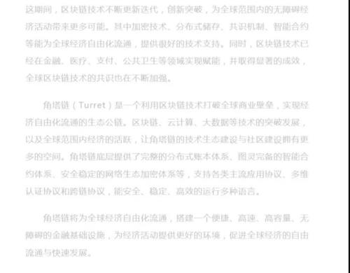 TUR币白皮书显示,Turret(角塔链)是一个利用区块链技术打破全球商业壁垒,实现经济自由化流通的生态公链(所谓公链,即链条上所有节点向公众开放,人人都可以参与其中,是完全去中心化的区块链),旨在为全球经济自由化流通,搭建一个便捷、高速、高容量、无障碍的金融基础设施,促进全球经济自由流通和快速发展。