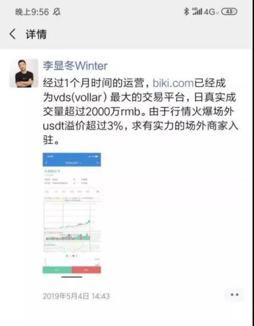 Biki CEO李显冬其朋友圈大肆炫耀的明星项目VDS,总发行量21亿枚,集资额逾13亿人民币。李显冬称其日真实成交量超过2000万人民币。