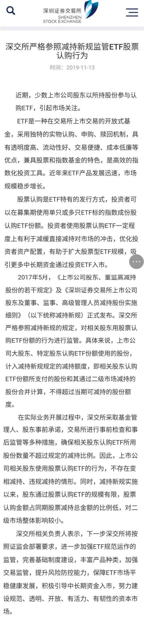 1、深交所严格参照减持新规的规定,对相关股东用股票认购ETF份额的行为进行监管。