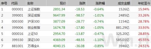 11月15日,沪深两市开盘后震荡走低,截至收盘,上证综指跌0.64%报收于2891.34点;深成指跌1.01%报收于9647.99点;创业板指跌1.05%报收于1674.78点,万得全A总成交近4000亿元,较前几日略有放量。