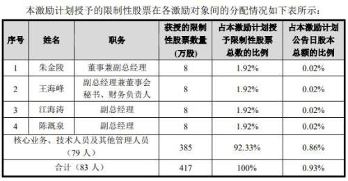 其中,向27人授予950万股限制性股票。副总经理兼财务总监王莹娇等3人获授的限制性股票数量分别为20万股;董事会秘书杨祖伟10万股,其他核心管理、技术、业务人员23人共计880万股。