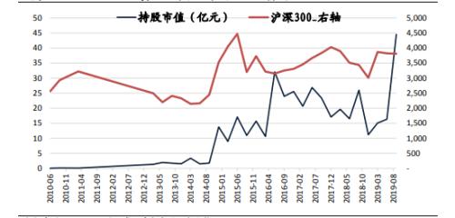 最新持股个数和市值达到历史新高。ADIA在A股市场上的投资先是经历了从2010-2016年的上升阶段。在该阶段内,无论是持股数量还是持股市值均处于上升的态势。截至2016年6月30日,ADIA的持股数量及持股市值一度到达高峰,共持有23只A股,市值高达32.08亿元。此时正是中国A股市场经历2015年年中下跌后的股市底部阶段,ADIA趁此机会大幅买进A股相关个股。2016年年中至2018年年底,ADIA持有的A股证券数量及持股市值整体处于下降的趋势。然而,今年三季度,ADIA在年中获取新的QFII额度后,大举加仓A股,ADIA在A股市场持股在前十大流通股的股票个数共29只,持股市值为44.5亿元,持股个数和持股市值均达到历史新高。