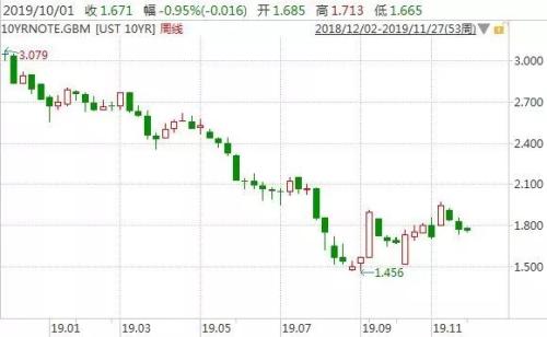 令市场大跌眼镜的是,美联储今年不仅没有继续加息,反而降息三次。十年期美国国债的收益率在2019年稳步下降,9月初跌至约1.45%,原因是人们担心世界经济将步入衰退领域。