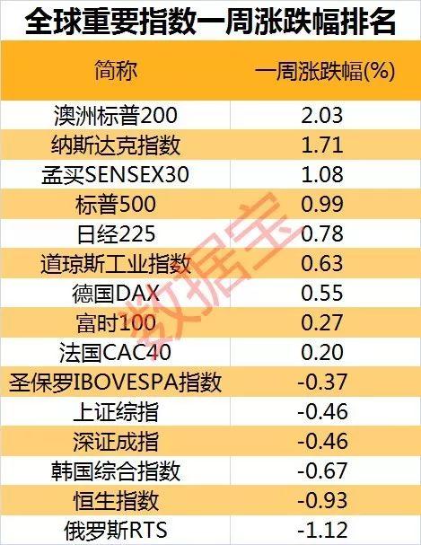 本周全球主要市场股市涨多跌少,澳洲标普200指数周涨幅2.03%,排名第一,指数刷新历史新高;因感恩节,美国市场本周四休市,周五提前三个小时收盘,欧洲三大股指均小幅上涨;俄罗斯RTS指数下跌最大,周累计下跌1.12%。