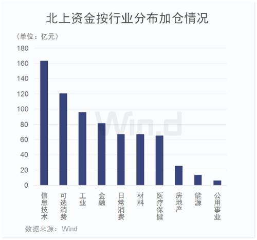 Wind统计显示,11月份以来,获得北上资金净买入金额超过1亿元公司有212家。从相关公司所属行业加仓金额分布来看,信息技术行业最多,超过160亿元;可选消费行业紧随其后,亦超过120亿元;此外,工业、金融、日常消费、材料、医疗保健等板块加仓金额均超过60亿元。可见,11月份以来,信息技术、大消费以及传统的材料、工业板块均是北上资金重点加仓目标。