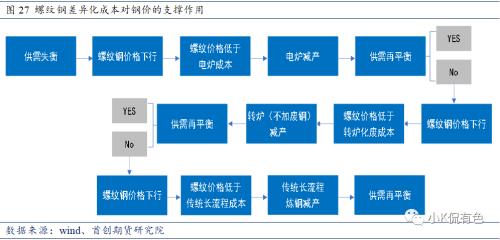 理论上,若螺纹钢终端需求存疑,螺纹钢供给相对过剩,在螺纹价格下行阶段,完整的逻辑链条应该是螺纹钢价格不断下跌,逐级打破螺纹钢成本,以降低供给,直到形成新的供需平衡为止。但是,长流程钢厂主动减产成本、停产重启成本巨大,使得价格调节供需机制难以有效发挥,而相对高价短流程电炉成本以及短流程灵活机动的生产方式成为了市场“无形之手”主要发挥作用的途径。