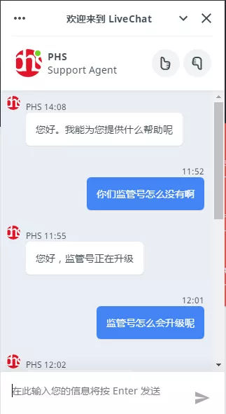 然后问PHS外汇的官方客服,客服说监管号在升级