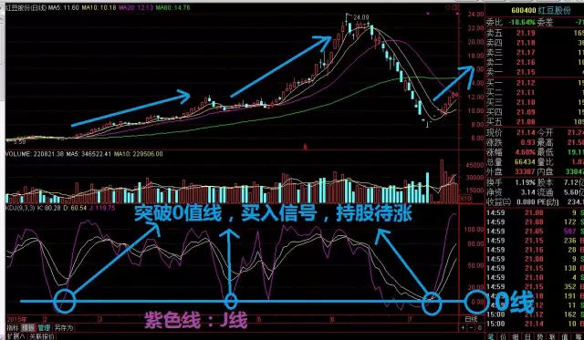 当J线连续多日在0下方,一旦回升到0上方,就表明空方力量消耗严重,多方力量复苏,是一个积极的买入信号。且J线在0下方的时间越长,该形态的看涨信号越强烈。