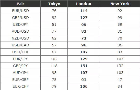让我们看一下在每个交易时段主要货币对的平均波动点数是多少?