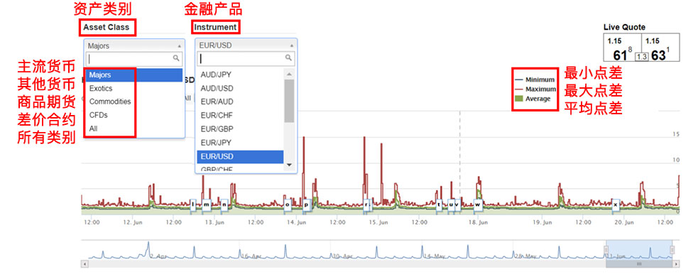 在图表的右侧可以选择查看最小点差,最大点差,或者是平均点差,图表中蓝色的线条表示最小点差,红色的线条表示最大点差,绿色的线条表示平均点差。