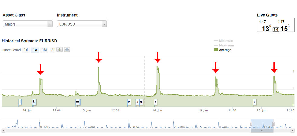 通过观察近期点差图表,可以看到EUR/USD一周报价周期内点差图表的变动情况,大约在北京时间每天凌晨5点左右,点差有明显扩大的趋势。我们可以看到,该时间段正值纽约市场关闭,悉尼时间开启的时间节点,由于市场流动性减少,因此在时间段内点差有所扩大,比较介意点差扩大的交易者可以避开该类时段进行交易。