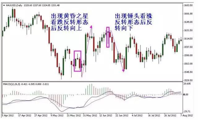 从理论上来说,有一些带有明显反转意义的 K 线组合也会出现一些假突破,例如黄昏 早晨之星以及看跌看涨抱线的吞没形态,有时候出现这种明显带有方向的信号后,其 后也会有反向运动的情况。