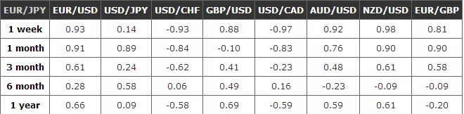 看一看下面的表格。每个表格反映了主要货币对和其他货币对在不同时间段内的相关性。