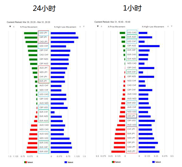 另一方面,如果查看短期的1小时的波动,可以确认到除了日元对所有货币强势之外,欧元对日元、瑞士法郎、美元之外的货币处于反弹中。