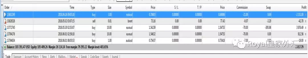 现在总共我们现在的持仓有3手新美,0.01手原油,20手欧澳以及1手澳美, 因此我们的交易总共需要买进30万新西兰元,200万欧元以及10万澳元,并卖出10桶原油, 根据当时的汇率显示
