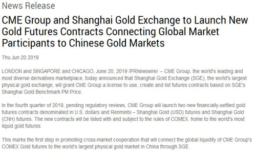 芝商所和上金所达成合作,将于今年第四季度推出新的黄金期货合约。据芝商所(CME)官网公告,芝商所与上海黄金期货交易所将在2019年第四季度推出新的黄金期货合约,该合约可以以美元或人民币结算,以上海黄金午盘基准价为最终定价。