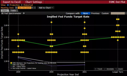 大多数官员预计到2020年底基准利率将低于目前水平。官员们还普遍下调了对中性利率的预期,即不刺激也不会减缓经济增长的利率水平。这一迹象表明,更多的官员认为,美联储的利率立场对经济的支持力度低于此前的预期。略微多数的官员目前预计中性利率将维持在2.5%左右。今年3月,中性利率的预期中值为2.75%。