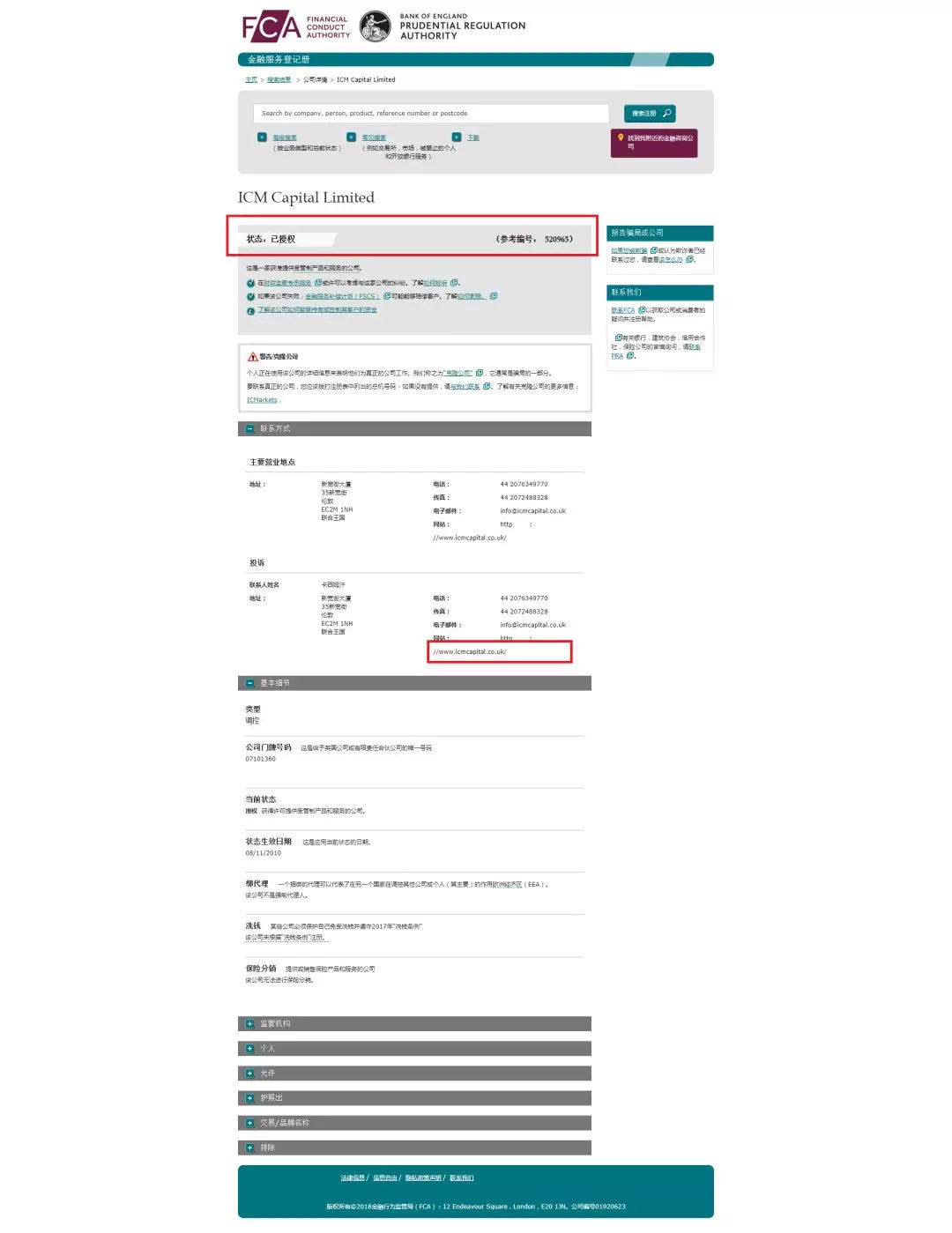 艾森ICM Capital英国金融行为监管局FCA查询