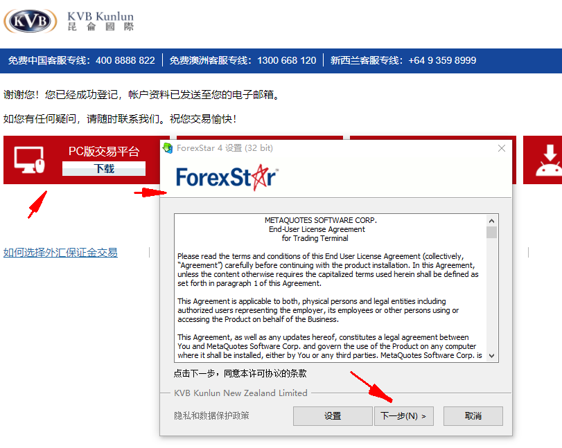 3.注册后后进入下面的图,账户资料发送到了你填写的邮箱资料中,然后就可以根据自己的操作设备选择下载交易软件