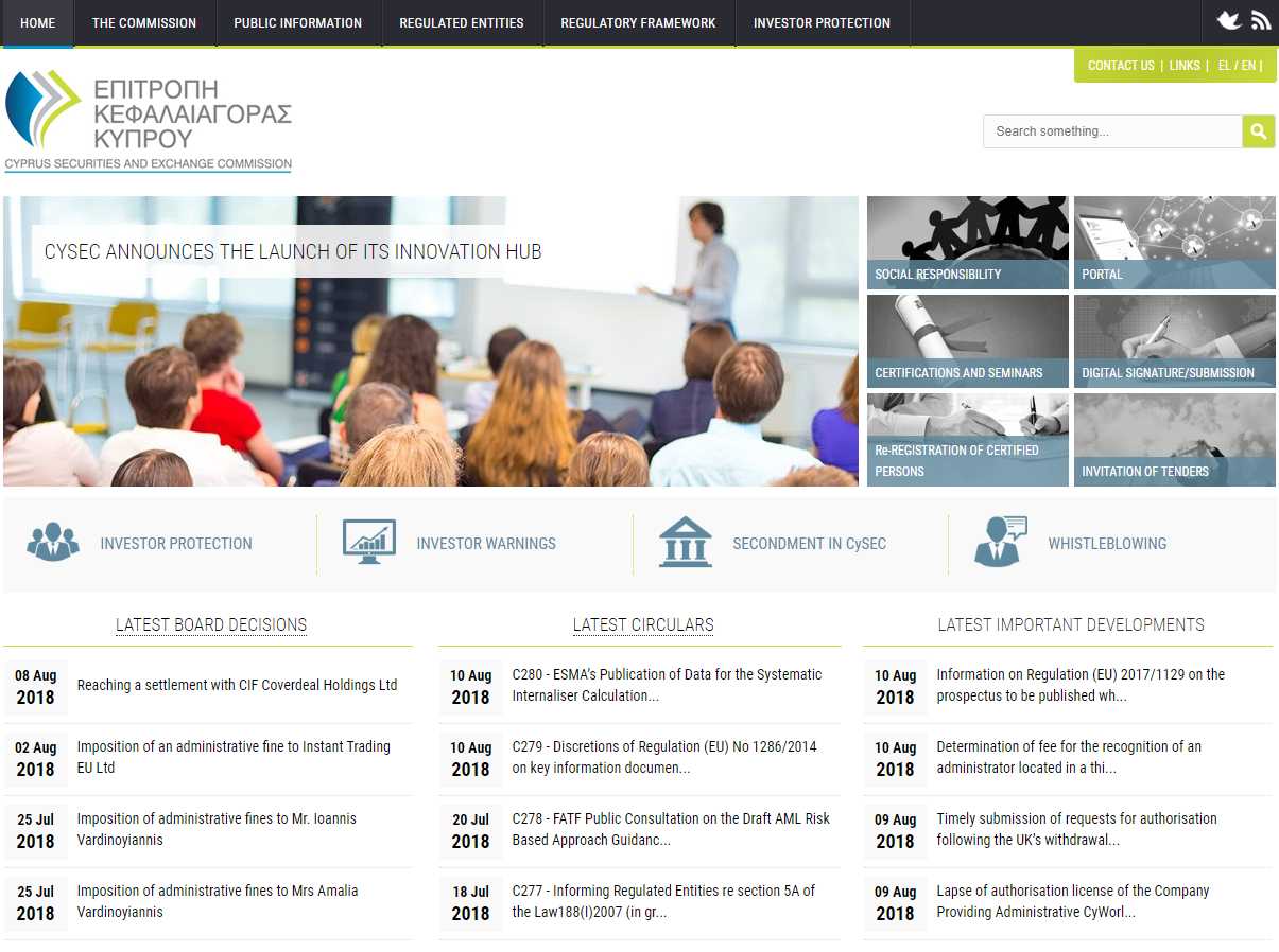 塞浦路斯证监会(CySEC)成立于2003年。塞浦路斯证券交易委员会,英文全称Cyprus Securities and Exchange Commission ,简称CySEC。CySEC是一个独立的公共监督机构。该机构负责监管塞浦路斯共和国境内的投资服务市场和可转让证券的交易,并且值得注意的是,大量海外零售外汇经纪商和二元期权经纪商已从CySEC获得注册 。