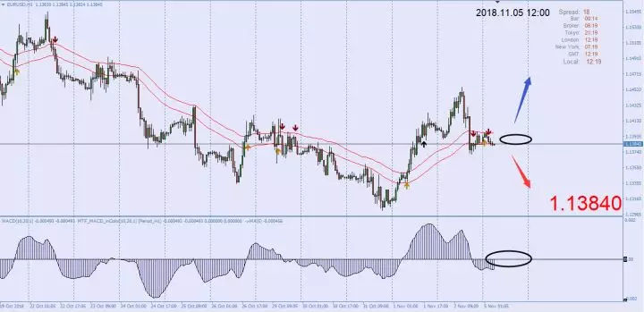 欧元兑美元的汇价目前运行在图中所示的1.13840,欧元从周五非农前的1.1450附近高位回落,目前在1.1400下方徘徊,同样的技术走势等待进一步的推动和突破。