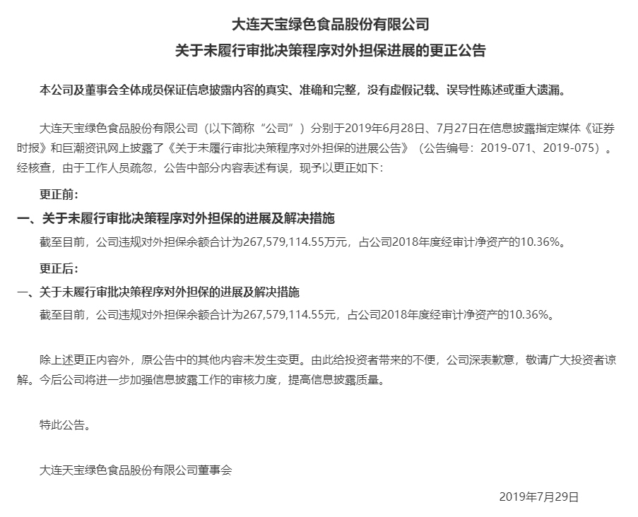 除虚开发票之外,黄作庆及 ST 天宝亦另有官司缠身。7 月 29 日,ST 天宝还披露了《关于未履行审批决策程序对外担保进展的更正公告》。更正后,在关于未履行审批决策程序对外担保的进展及解决措施一款中,截至目前,公司违规对外担保余额合计为 267,579,114.55 元,占公司 2018 年度经审计净资产的 10.36%。