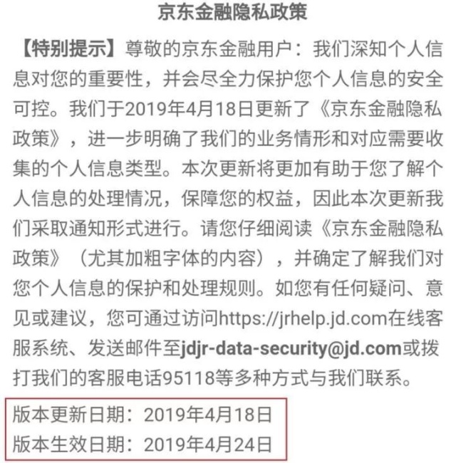 《移动APP违法违规问题及治理举措》在“2019年网络安全专题发布会”上发布,京东金融App遭到点名,原因是“App未按照其隐私声明申请隐私权限”。据移动支付网了解,京东金融在2019年4月18日更新了隐私政策,并在4月24日正式生效。