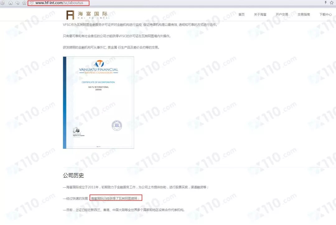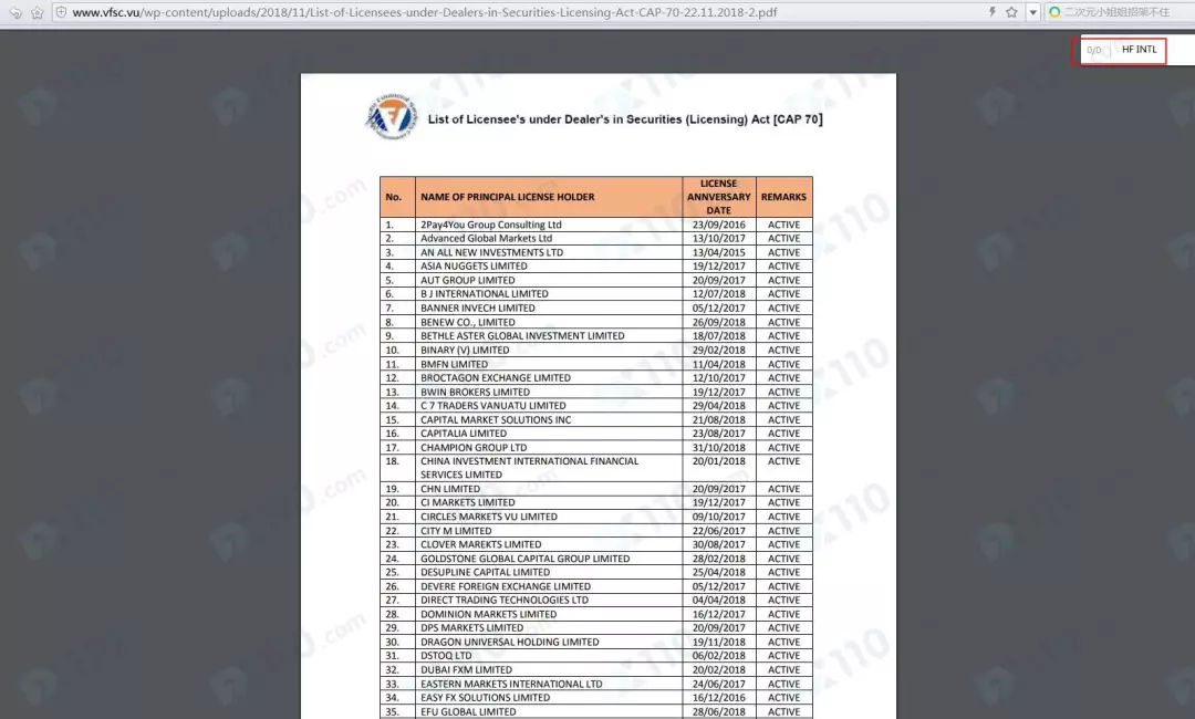 描述:经查询,在VFSC官网依次输入“HF INTL”“HFI Index”“HAI FU”,均未查询到任何搜索结果,且瓦努阿图VFSC无任何监管效力。
